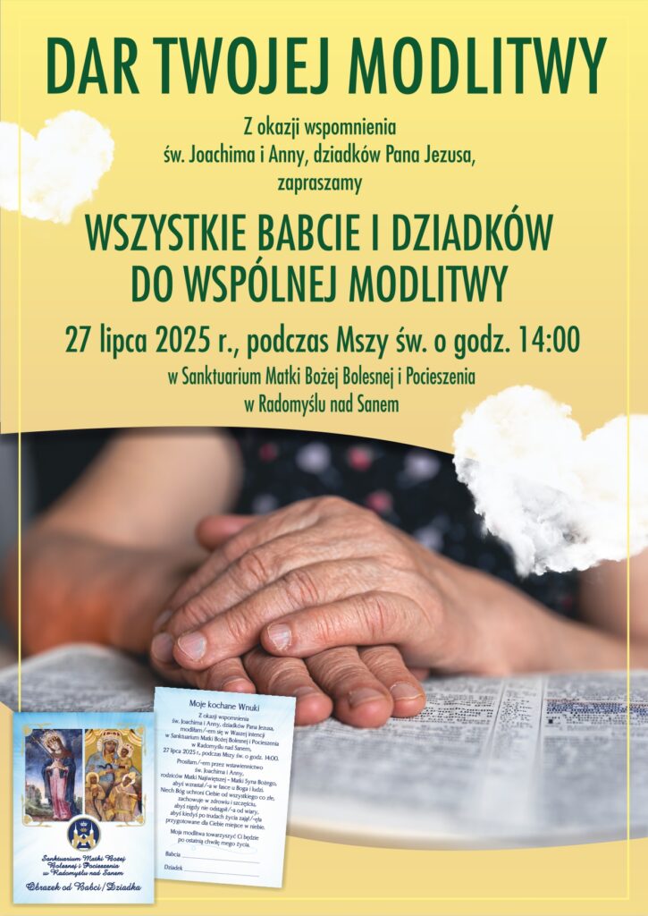 Liturgiczne wspomnienie św. Joachima i Anny, rodziców Najświętszej Maryi Panny – Matki Zbawiciela, jest okazją, aby modlić się za swoje wnuki, albo o swoje wnuki. Darem dla wnuka niech będzie modlitwa Dziadków w czasie Mszy św. 27 lipca o godz. 14:00. Wcześniej o godz. 13:30 – modlitwa różańcowa. Zapraszamy do wspólnej modlitwy Dziadków, którzy w ten sposób chcą okazać swoją troskę i miłość dla swoich wnuków i wypraszać dla Nich potrzebne łaski przez wstawiennictwo Matki Bożej Bolesnej i Pocieszenia. Zapraszamy